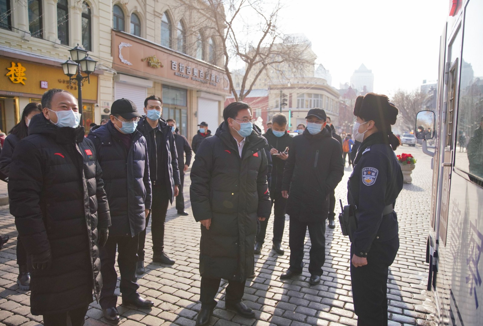 在南岗交警大队大厦岗,胡昌升慰问坚守岗位的执勤交警。他说,越是万家团圆时,公安交警这种舍小家为大家的精神越令人钦佩。他要求执勤交警文明执法,担负好疫情防控职责,维护城市良好交通秩序。