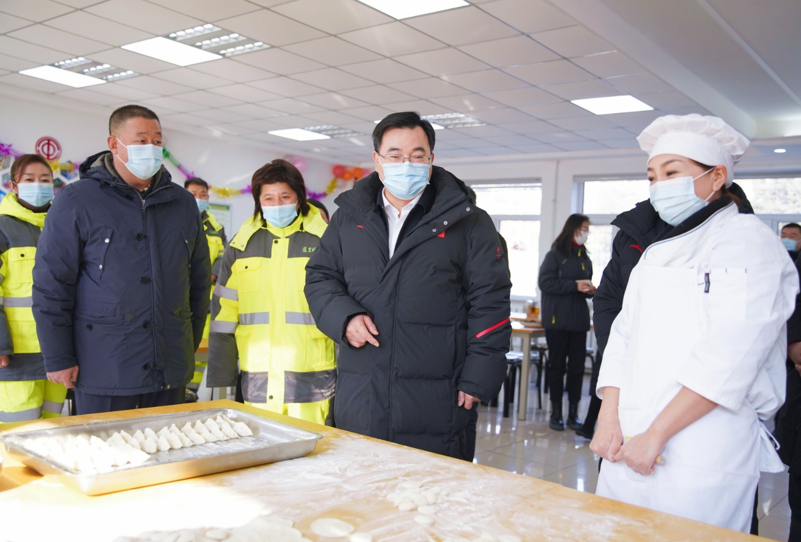 道里区环卫工人综合服务中心里年味十足,桌上摆着水果、花生和瓜子,环卫工人们正在包饺子。胡昌升走进服务中心,握住60岁女环卫工徐凤琴的手说,你们是城市美容师,在新春佳节之际依然辛勤地工作,你们辛苦了!他还叮嘱环卫工人在作业时注意安全和工作环境疫情防控,做好个人防护和保暖。