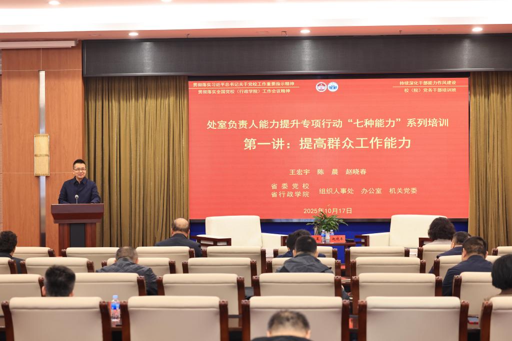 为深入学习贯彻习近平总书记关于党校工作的重要论述、重要指示精神和全国党校(行政学院)工作会议精神,持续深化干部能力作风建设,提升党员干部履职能力,10月17日,校(院)以“学理论·强党性·转作风·提能力”为主题,持续推进“处室负责人能力提升专项行动”,聚焦习近平总书记要求领导干部必须具备的“七种能力”开展系列专题培训。系列专题培训的第一讲以《提高群众工作能力》为主题,并同步作为年度校(院)党务干部培训班的开班第一讲。副处级以上党员干部及各支部党务工作者参加培训学习。