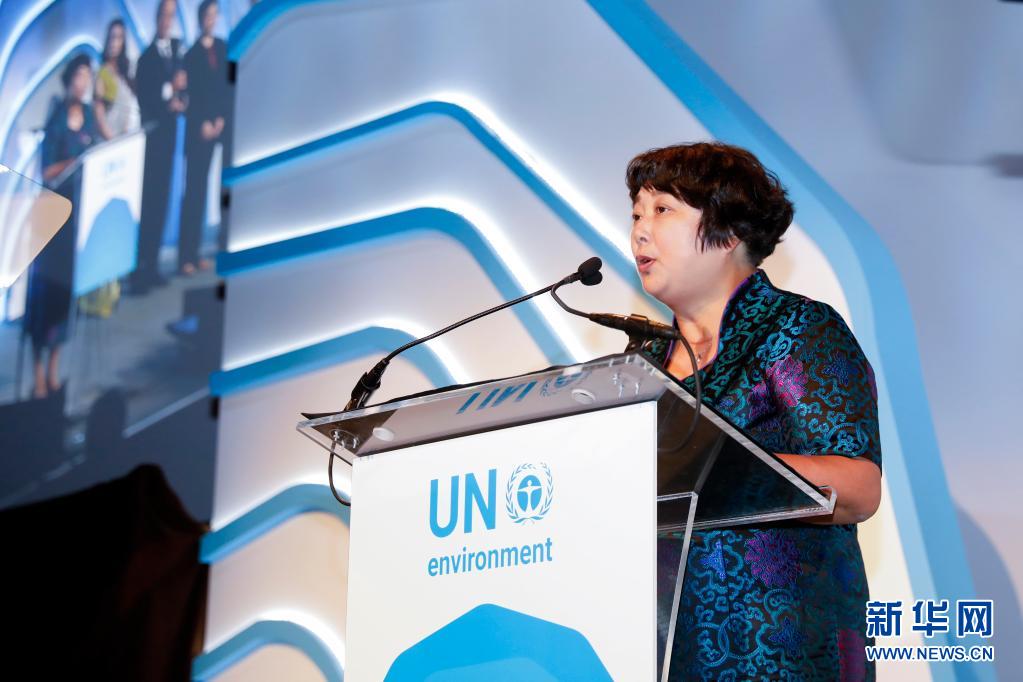 联合国环境规划署“地球卫士奖”颁奖典礼在美国纽约举行,浙江省安吉县递铺镇鲁家村村民裘丽琴在颁奖仪式上发表获奖感言(2018年9月26日摄)。新华社记者 李木子 摄