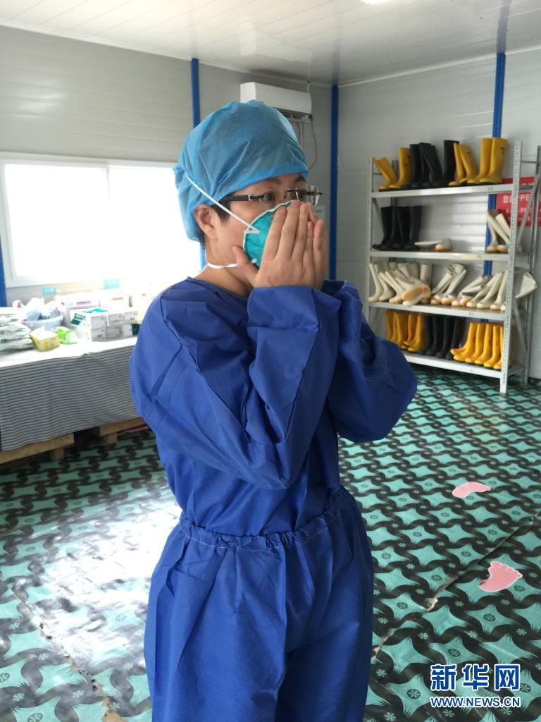 高春华在利比里亚工作期间,进入隔离病房前测试口罩密闭性(2015年2月12日摄)。新华社发(受访者供图)