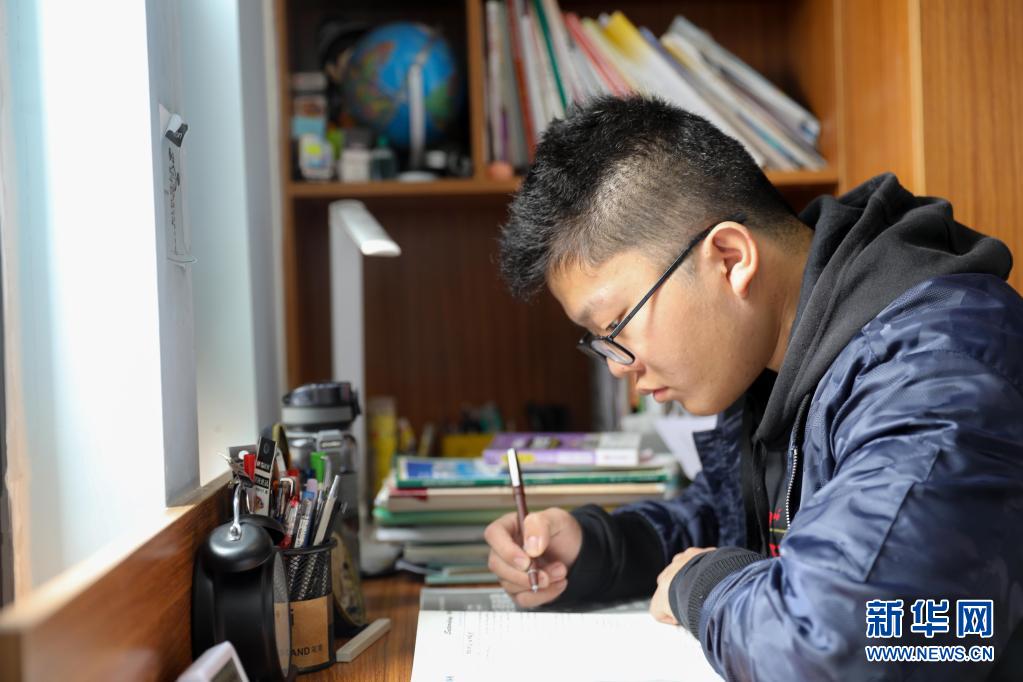 赵德莉的儿子江博在家里做作业(3月20日摄)。新华社记者 曹力 摄