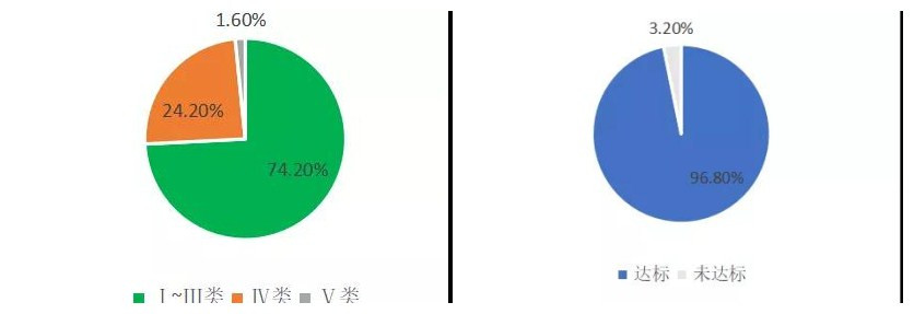 左全省考核断面水质类别统计、右全省考核断面达标比例统计