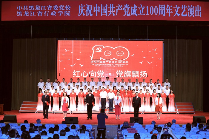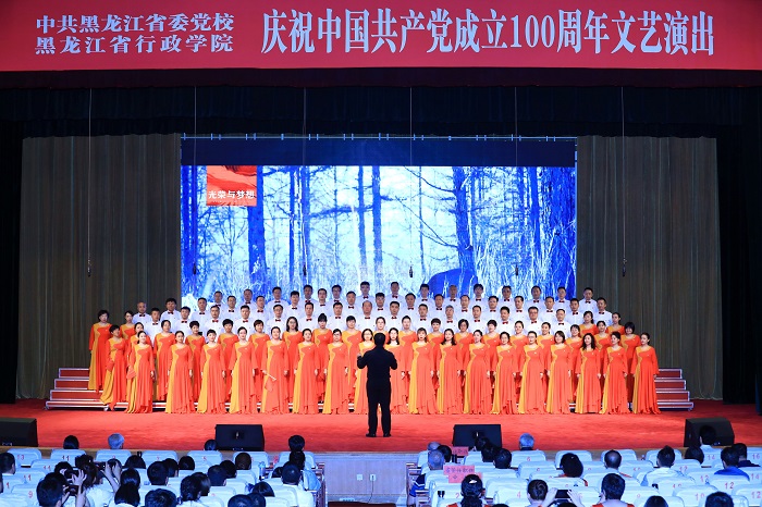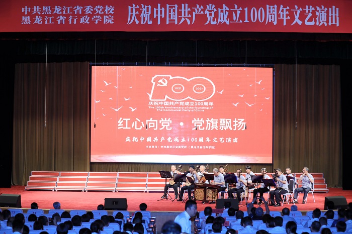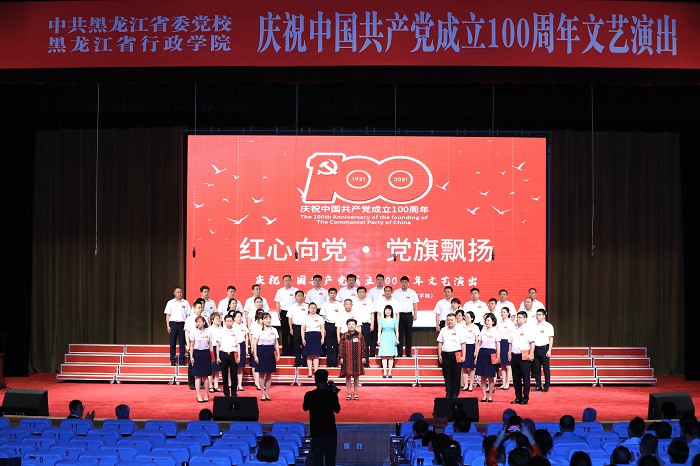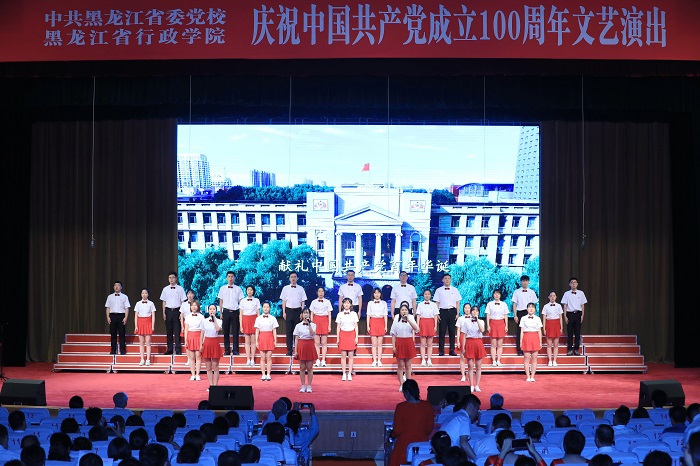 6月28日,省委党校(省行政学院)报告厅内座无虚席,《红旗颂》乐曲回荡不息,下午14时,舞台追光灯聚焦两位主持人,中共黑龙江省委党校(黑龙江省行政学院)庆祝中国共产党成立100周年“红心向党,党旗飘扬”文艺演出拉开帷幕。校(院)委会全体成员、离退休老干部代表、全校(院)党员干部职工、在校主体班学员和硕士研究生欢聚一堂,共同庆祝中国共产党百年华诞。